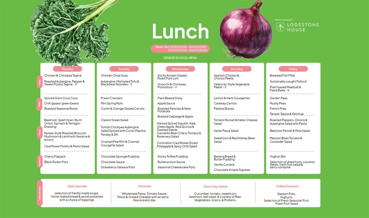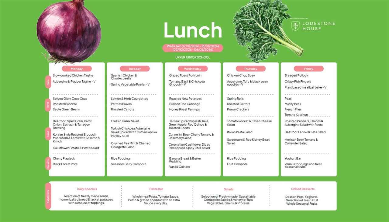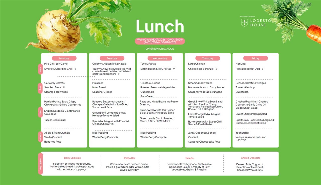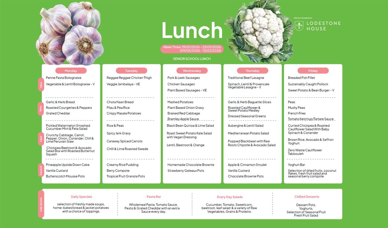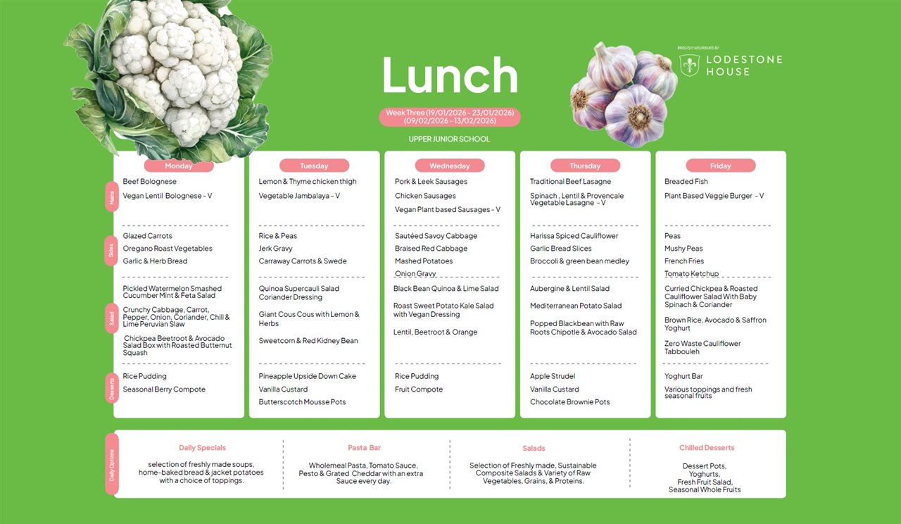 Please see the weekly lunch menus for Lower Juniors, Upper Juniors and Seniors below - they rotate every three weeks on the dates indicated.