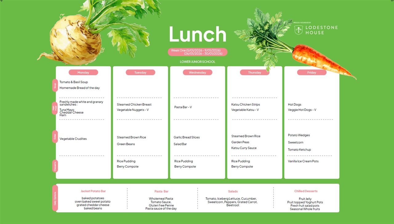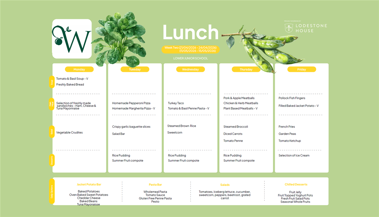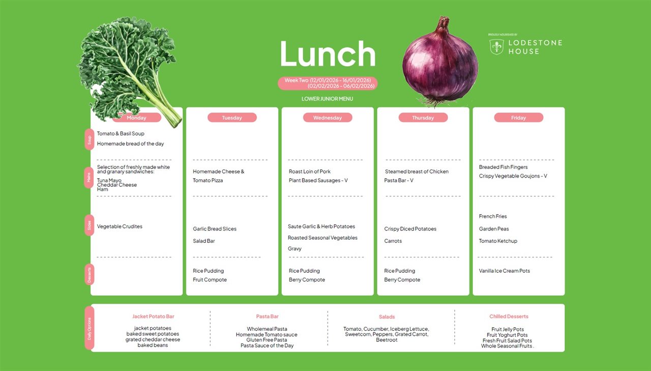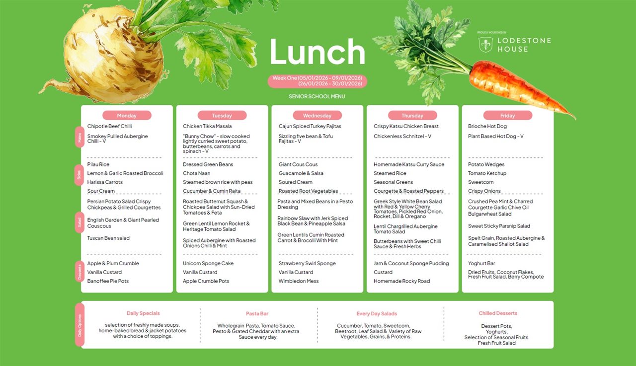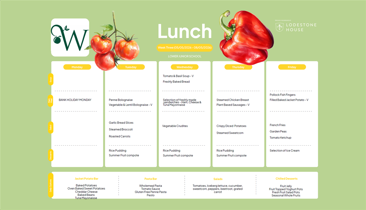 Please see the weekly lunch menus for Lower Juniors, Upper Juniors and Seniors below - they rotate every three weeks on the dates indicated.