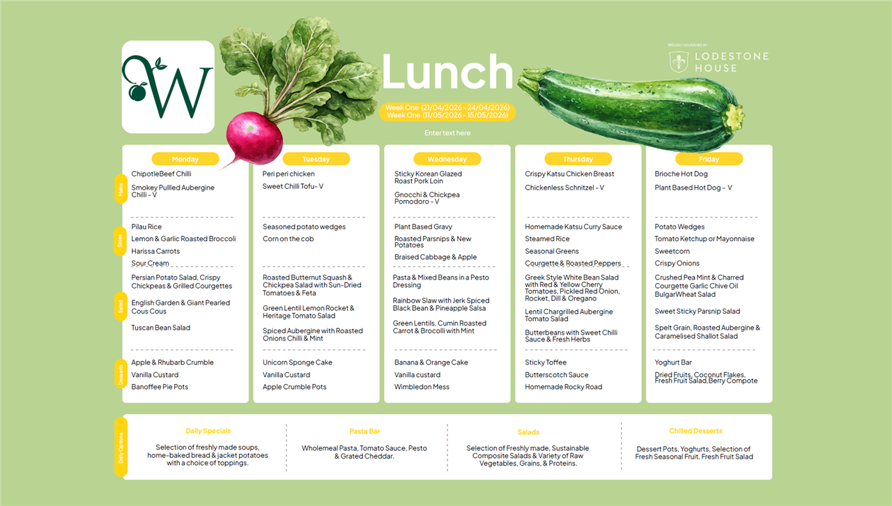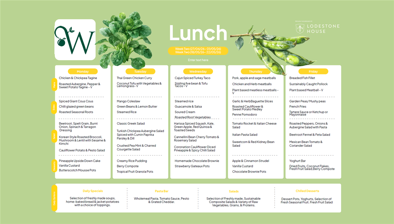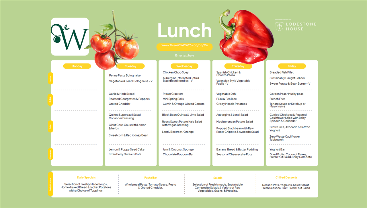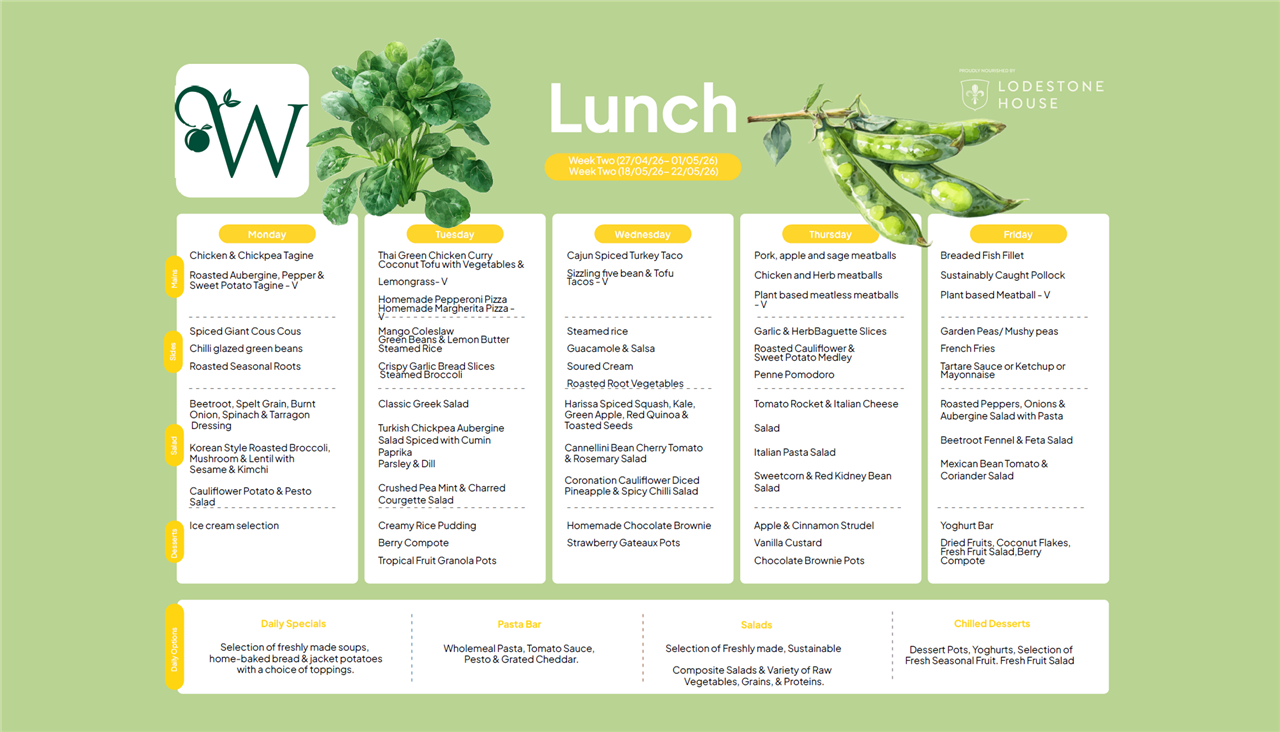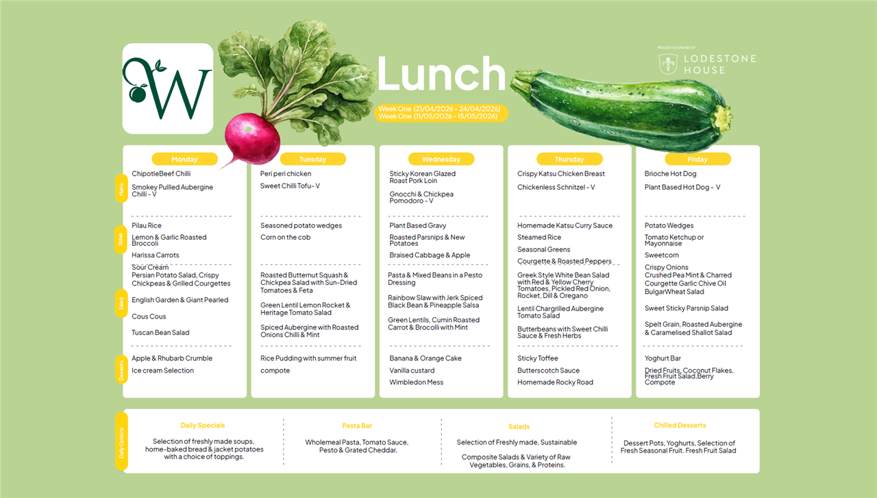 Please see the weekly lunch menus for Lower Juniors, Upper Juniors and Seniors below - they rotate every three weeks on the dates indicated.